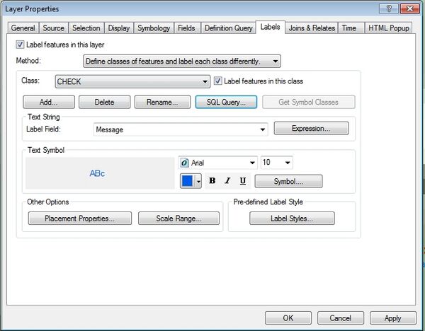 - Open the layer properties, by right clicking on the layer in the table of contents and selecting properties. Navigate to the Labels Tab. In the Method Option, from the drop box select Define Classes of features and label each class differently.
