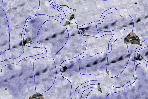 When the 2D flow patterns are observed, as per the velocity arrows in the image below, the water appears to be “cascading” down the roads. Along the flat areas the velocities are low, and where the elevations suddenly drop to the next flat section the velocities are high, thereby creating the cascading effect.