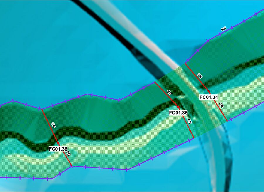 In the example below, the HX lines are broken between FC01.35 and FC01.34 as a culvert is located between these nodes.