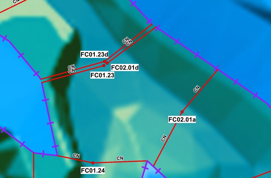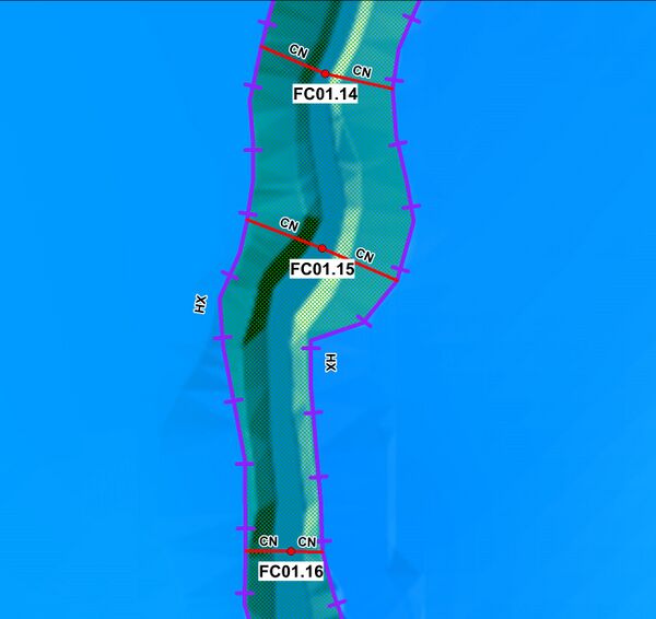 - Interrogate one of the lines connecting the x1D node to the HX line. These are the connection or ‘CN’ lines that read the water level from Flood Modeller and transfers this to the HX line. In the figure below, the water level is calculated in Flood Modeller at the nodes FC01.16, FC01.15 and FC01.14. These water levels are linearly interpolated along the lengths of the HX line on each of the left and right banks of the watercourse. When the water level exceeds the ZC elevation of the boundary cell, water is able to flow out onto the TUFLOW 2D floodplain.