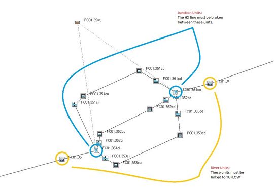 Note that where there are junctions within the Flood Modeller 1D model (i.e. at structures), both the nodes immediately upstream and downstream must be connected to TUFLOW. Refer to the below figure where the junctions are circled in blue and the upstream and downstream RIVER units are circled in yellow. The HX lines must be broken between the junctions as this is a requirement of a linked Flood Modeller – TUFLOW model. In the example below, the HX lines are broken between FC01.35 and FC01.34 as a culvert is located between these nodes.