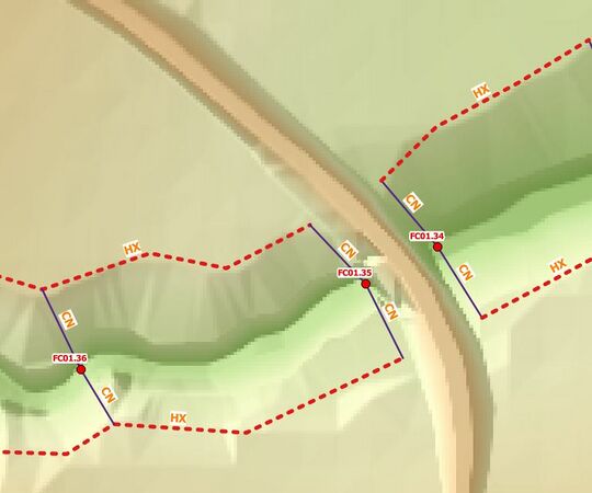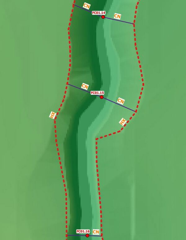 6. In the figure below, the water level is calculated in Flood Modeller at the nodes FC01.16, FC01.15 and FC01.14. These water levels are linearly interpolated along the lengths of the HX line on each of the left and right banks of the watercourse. When the water level exceeds the ZC elevation of the boundary cell, water is able to flow out onto the TUFLOW 2D floodplain.
