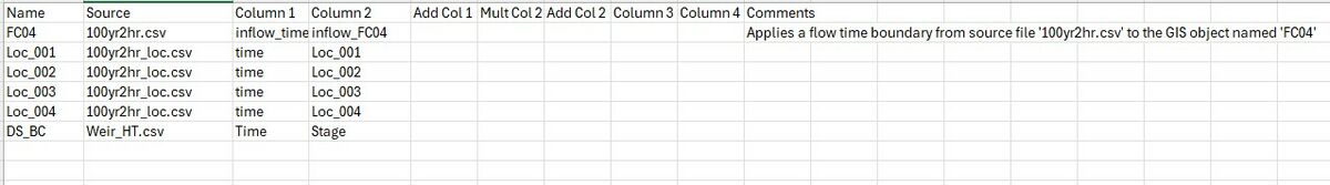 - An additional row needs to be added to bc_dbase_FMT_M02.csv to apply the stage-time values from Weir_HT.csv. The revised bc_dbase should look like the figure below: