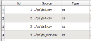- Reload the layer 1d_xs_FMT_M02_creek_001_L within QGIS from the project GeoPackage file. Turn on Toggle Editing mode and open Field Calculator. Select the field "Source" from the "Update Existing Field" dropdown and enter the expression '..\\xs\\' ||source to prepend "..\\xs\\" to all rows for this field. The results will be the Source will be set up as per the below image which will ensure that the locations of the csv files are correctly referenced.