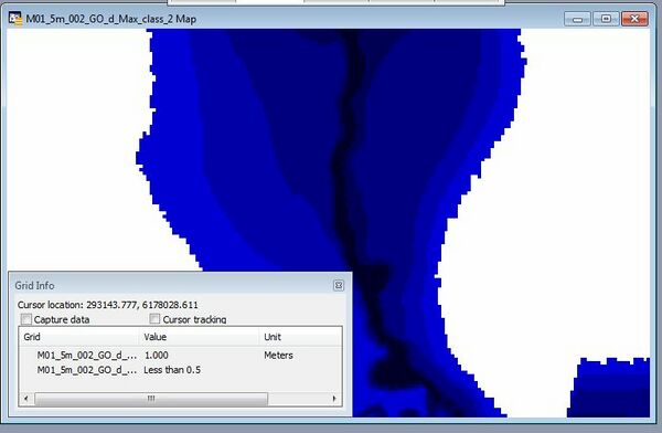 - Creates a new depth grid only where the depth is greater than 0.1m.