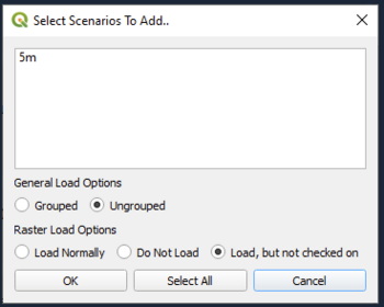 - Note: Since v3.5.2, if the user is using QGIS v3.22 or later the options are now included in the scenario selection dialog box and the option to import layers as 'grouped' or 'ungrouped' are also offered. If there are no scenarios to choose from, a dialog box will still appear with the new options.