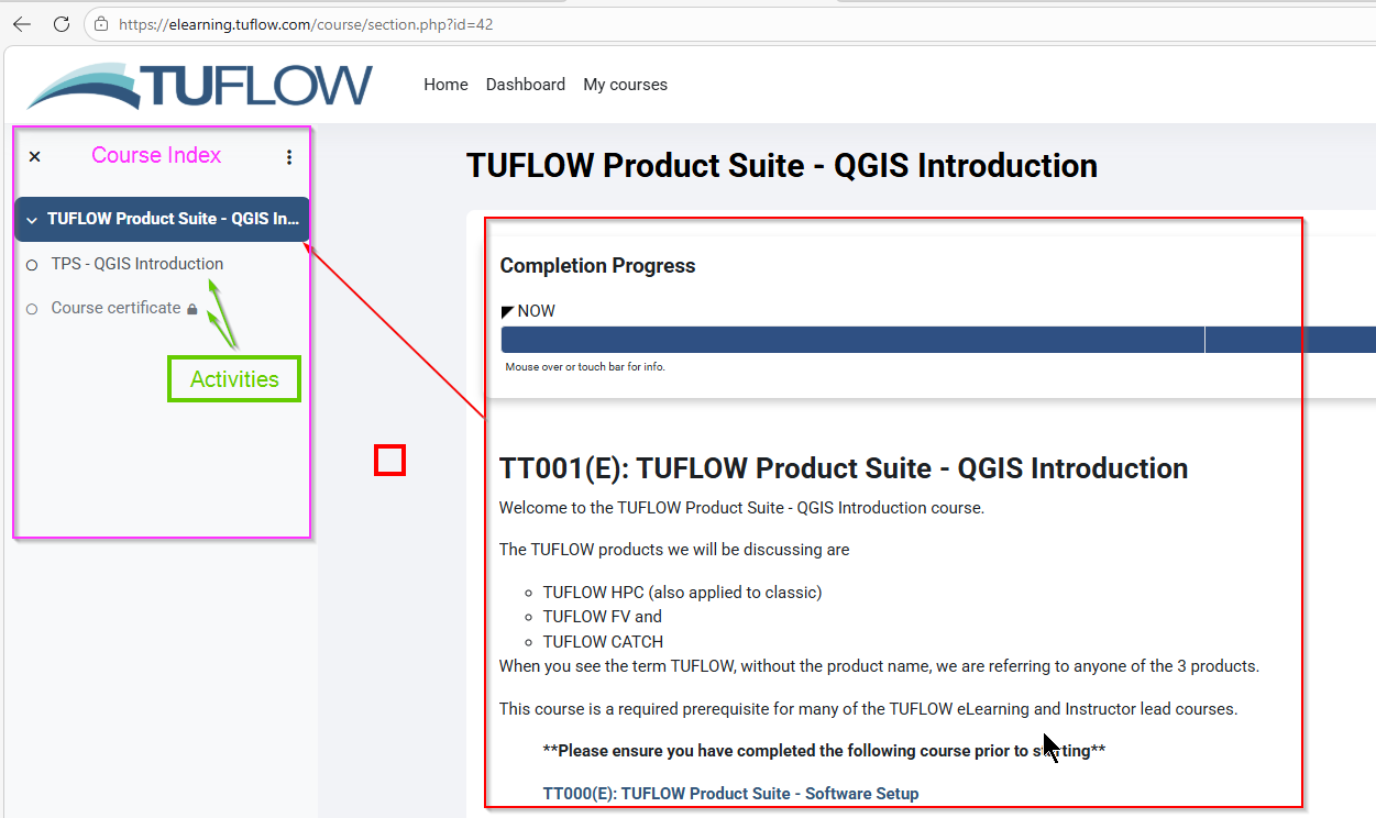 The course material, is split up into activities. The course above has a learning activity, TPS-QGIS Introduction and a certificate activity, Course certificate.