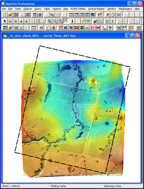 - Import the 2d_dom_check_M01 file from the tuflow\check\2d folder into your GIS package and ensure that it is visible, with the aerial photo or Digital Elevation Model (DEM) also visible the location should be as shown below.
