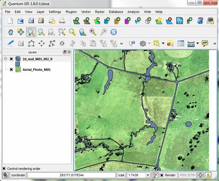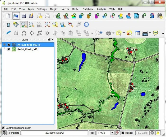 3. Load the TUFLOW\Model\gis\2d_mat_M01_002_R.shp file. The map window should be displaying the aerial photography, with a series of polygons covering certain areas, as per the image below.