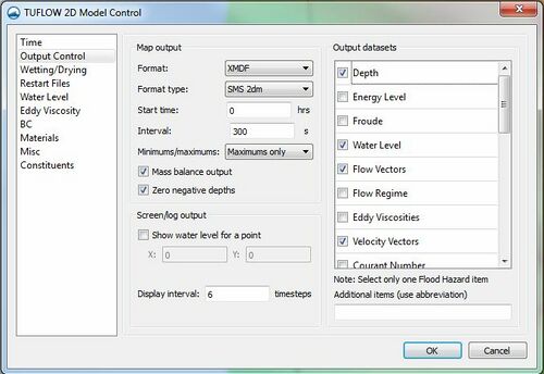 - In the Screen/Log Output section, change the Display interval to "6". While TUFLOW is running, it will write status information every 6th time steps.