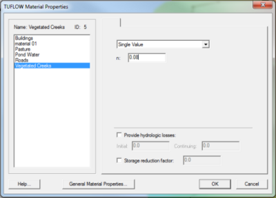 - Click on each material name and change the values for Manning's n for the materials according to the table below. Click OK when done.