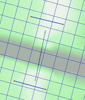 - Create two arcs near each end of the culvert covering about three grid cells as shown in the figure to the right. Water from each 2D cell that the arc selects will be conveyed in/out of the 1D domain. The arcs do not need to overlap with the culvert arc.
