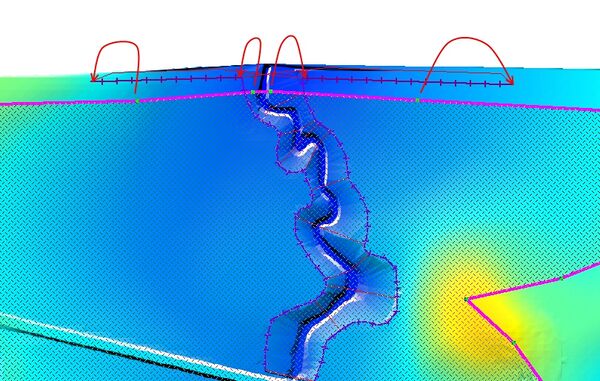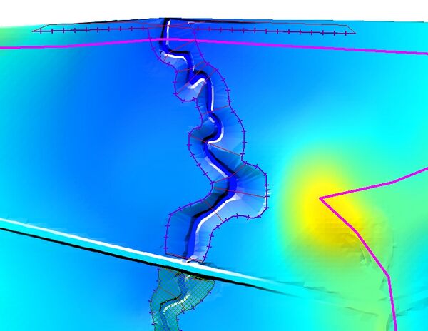 - Zoom into the downstream area of the model. There is a gap between the HX boundaries (1D/2D boundaries) and the active code area. If we leave the model with this configuration, water will not be able to leave enter the 1D model from the floodplain. The area is shown in the image below.