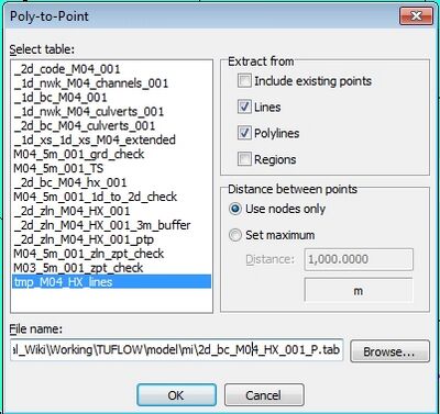 4. In the dialogue, select extract from Lines and Polylines. Select Use Nodes only and set the output file to 2d_bc_M04_HX_001_P (in the TUFLOW\model\mi\ folder). The _P indicates that this file contains points. Select OK to begin the conversion.