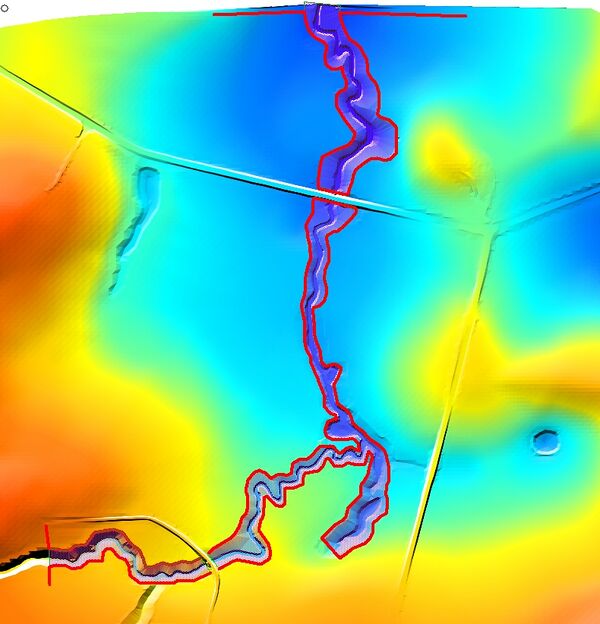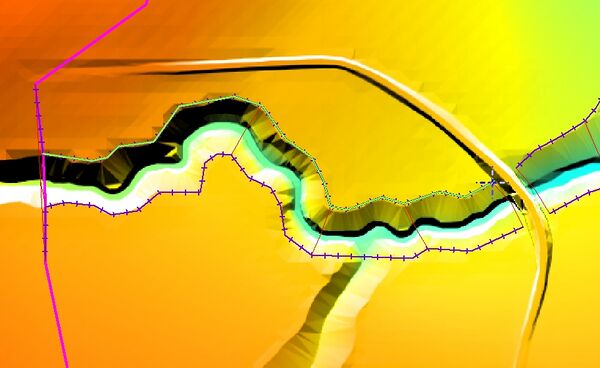 - Zoom into the downstream area of the model. There is a gap between the HX boundaries (1D/2D boundaries) and the active code area. If we leave the model with this configuration, water will not be able to leave enter the 1D model from the floodplain. The area is shown in the image below.