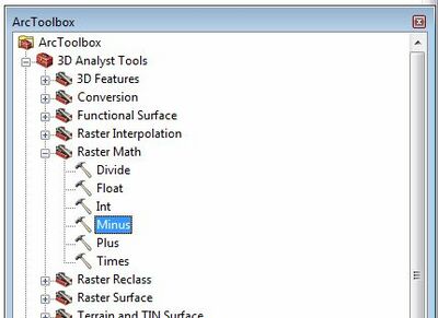 - To calculate the flood impacts we will subtract the existing case results from the developed case. To do the open the 3D Analyst Tools>> Raster Math >> Minus item from the toolboxes: