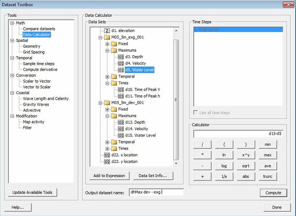 - In the data calculator dialogue double click on the maximum water level results for the developed case, then select the subtract operator and then add the maximum water level results for the existing case to the calculator expression. Give the Output Dataset an appropriate name (e.g. "dhMax dev - exg"). Press Compute to perform the calculation.