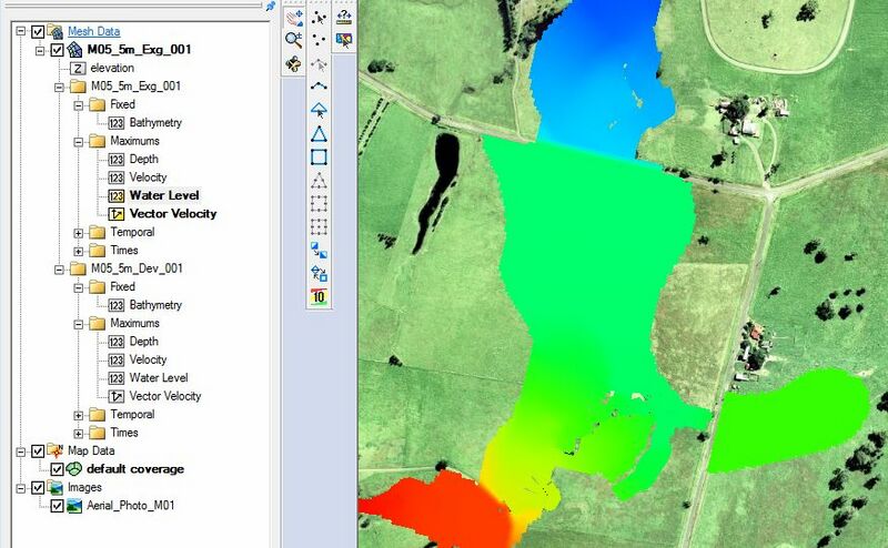 - Open the existing case (M05_5m_Dev_001.xmdf.sup) results from the TUFLOW\results\M05\2d\ folder. This opens the results geometry (M05_5m_Exg_001.2dm) and the existing case results (M05_5m_Exg_001.xmdf).
