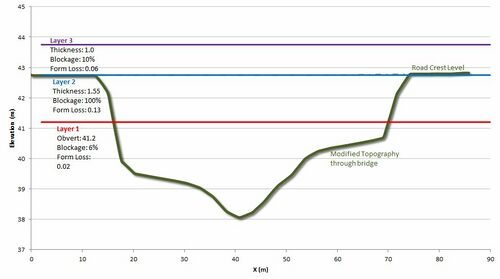- Percentage blockage below the obvert of layer 1 to account for any blockages perpendicular to the direction of flow (in this case 6% to account for the average blockage due to the bridge piers).
