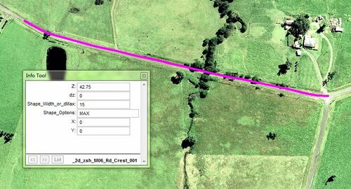 Open the newly saved layer 2d_zsh_M06_Rd_Crest_001 in Mapinfo. This layer contains a single polyline which we will use to overwrite the road crest elevations previously defined in Module 3. Populate the line with the following: