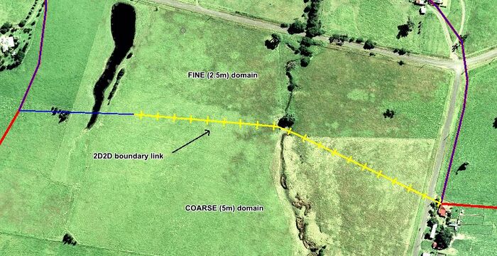 Multiple 2D domain models use the 2d_bc “2D” link type as the boundary cells for transfering flow between the neighbouring domains.
