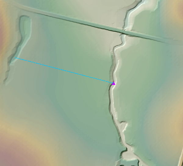 - Using the Edit tool, select the pump object contained in the Pump layer. Copy the pump object, right click on the 2d_bc_M14_pump_001_P layer in the Table of Contents, select Edit Features and Start Editing. You can now select Edit >> Paste or Ctrl+V to paste the pump object into the 2d_bc layer. The location of the pump is shown below, with the reservoir to the west.