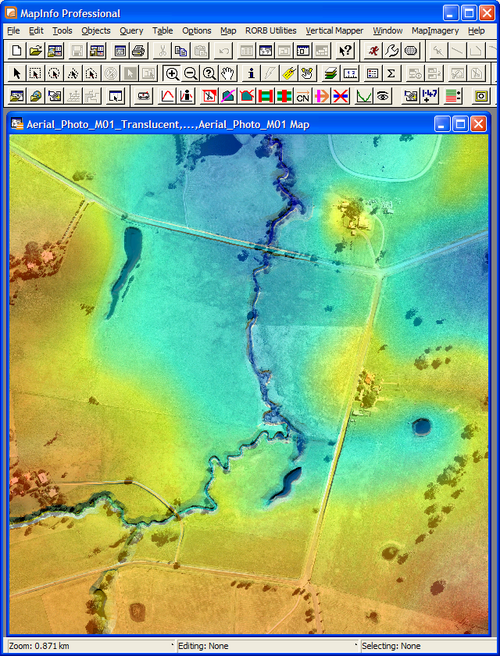 This page describes the process of creating a new MapInfo table and setting the projection. This layer is input to TUFLOW to set the GIS coordinate system of the model. Before starting this ensure that you have the DEM and aerial photo open in MapInfo and in a map window as per the image below: