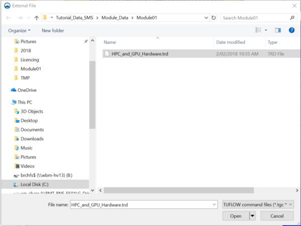 - Select the trd file included in the Module01 dataset: Module_Data\Module01\HPC_and_GPU_Hardware.trd. This text file contains the two TUFLOW commands required to call the HPC solver and GPU hardware.