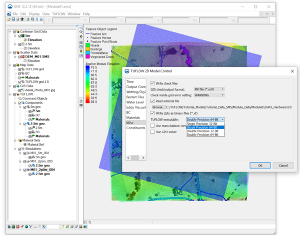 TULFOW HPC and its GPU module was included in the 2017 release of TUFLOW (2017-09-AA and later). The TUFLOW SMS interface currently (Version 12.2) does not include the required user options to selected and run a HPC simulation. An updated version of SMS is due for release in mid 2018 with the required option, until then this tutorial will demonstrate how to use call HPC and it's GPU module via a manual work-around.