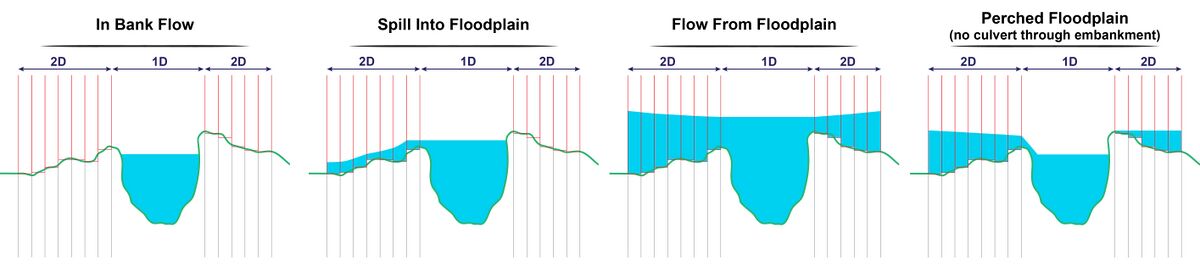 The water level is transferred between 1D to 2D through HX cells. It is important the 2D cell elevation reflects the correct level that water can spill out from one domain to another, thick breakline is required. 2D breaklines are described in detail in Module 2: