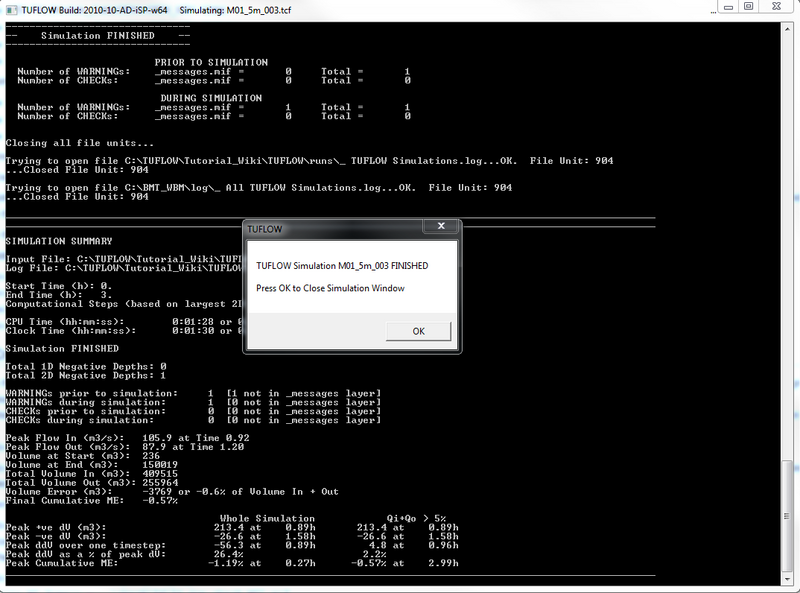 1. Start TUFLOW from a batch file using the TCF file we have created (M01_5m_001.tcf). Follow the steps outlined in, Running TUFLOW from a Batch-file to create the batch file.