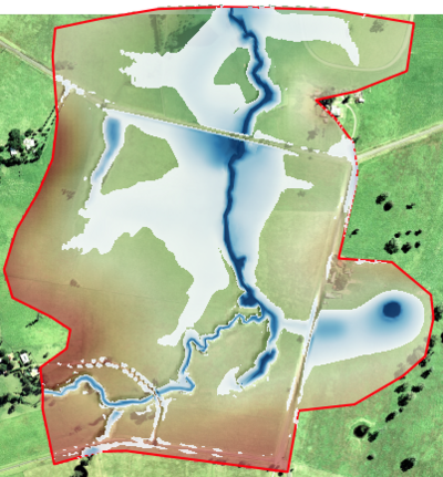 Visualising the velocity vectors in direct rainfall models provides a means to investigate flow paths and their behaviour. Note in the below image that a cut-off depth has been applied to the depth grid, but not the velocity vectors, thus the velocity and direction of shallow sheet flow can still be seen.
