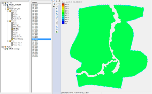 Cumulative rainfall (RFC) and rainfall rate (RFR) Map Output Data was also added to this model. These outputs will track the rainfall in mm/hr (RFR) and the total rainfall depth applied to the model over time (RFC). View these results in your preferred results viewing software.
