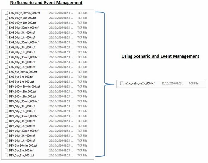 In previous tutorials, new TUFLOW Control File (TCF), TUFLOW Geometry Control (TGC) file and ESTRY Control Files (ECF) were required each time a different model scenario or event was modelled. During complex modelling projects this has the potential to result in a large number of input files. This can become a project management challenge. TUFLOW incorporates scenario and event control logic to overcome these challenges, significantly reducing the number of simulation files required during a complex project. The figure below shows a project requiring over 30 simulations consolidated into a single TCF file.