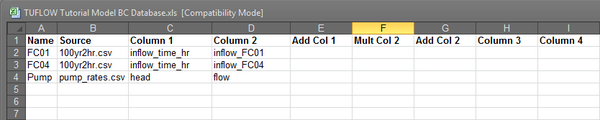 - Start by copying the template boundary condition database, TUFLOW Tutorial Model BC Database.xls, from the Module_Data\Module_14\Excel folder into the TUFLOW\model\bc_dbase folder (keep the same file name). Open the file using Excel.