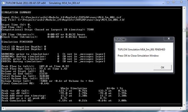 - Using your preferred method, detailed in Module 1 Running TUFLOW, start TUFLOW. I am using a batch file to start TUFLOW and I simply double-click on this file in Windows Explorer. The simulation will take a few minutes to process (depending on the speed of you computer). This is a good time to complete your Modelling Log and keep a record of your work and TUFLOW simulations. Modelling logs are discussed here. A template modelling log is included in the TUFLOW Folders Template\TUFLOW\ folder supplied with this tutorial.