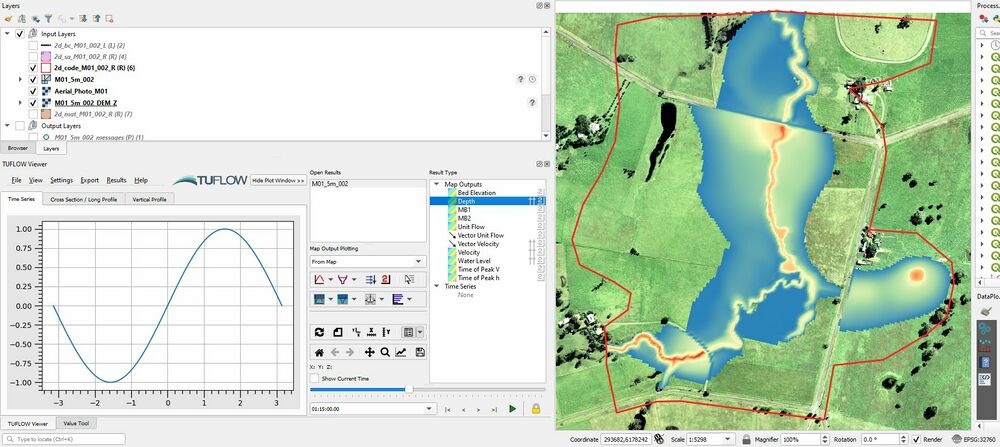 We have covered the basics of viewing 2D TUFLOW results in QGIS using the TUFLOW Viewer Plugin. Please return to the tutorial model, Module 1. In the next step we review the performance of the TUFLOW model (warnings, checks and mass balance), to return please click here