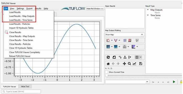 The results can either be loaded in via File Load Results or Right Click in the Open Results panel and choose Load Results. Load results uses a TCF, TLF or FVC and will load in all results (Map Outputs and Time Series). Alternatively, you can open the Map Outputs and Time Series results independently using: