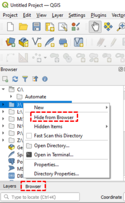 - Open QGIS "Browser" right click on the network drive and click "Hide from Browser".