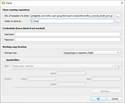 If using SSH keys the URL for the repository would be: git@gitlab.com: tuflow-user-group/third-party-tools/other/tuflow_tutorial_model_kart.git. Choose a suitable location to save the repository locally. |