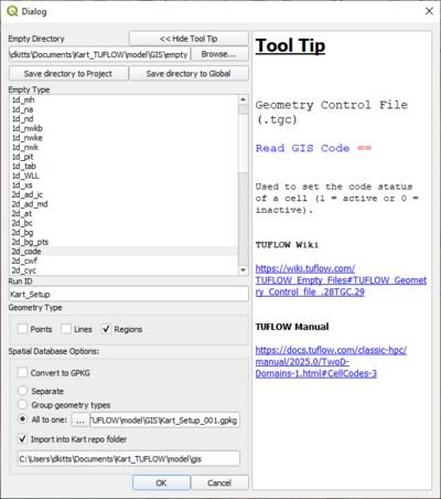 We can now start to build our TUFLOW model using the traditional steps of the Import Empty File tool within the QGIS TUFLOW Plugin. When importing the empty files, we can import to the gpkg in Kart repository using the options in the following image, ensuring to select the 'All to one' option and choosing to 'Import into Kart repo folder'.