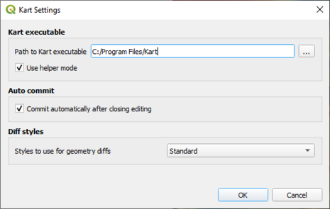 Once the plugin and Kart is installed, there is a Kart menu within QGIS with some settings. Specify the path to the installed Kart executable. There's an option to Auto Commit which will commit your changes to the repository when you 'Toggle editing' off within QGIS. This can be a useful option, although the drawback is that you are not prompted to add a commit message.[[File:Kart Settings.png|thumb|Kart Settings|alt=|none]] |