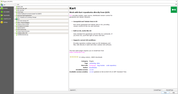 The first step is to install the Kart QGIS plugin. This is done using the Manage and Install Plugins tool within QGIS. Search for Kart and install the plugin.