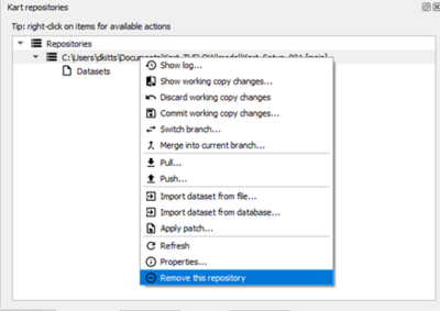 - We will now remap the repository to the GIS folder. In the Kart repositories panel, highlight the current repositiry and choose to 'remove this repository'. Click Yes when the prompt dialogue comes up.