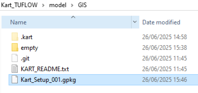 With the TUFLOW folders set up, there is now some fiddly steps to go through so that we can set up a Kart repository. This is because a Kart repository can only be set up for an empty folder but our GIS folder has an empty folder and a geopackage in it already. We also want to initialise Kart using the TUFLOW model name rather than have a geopackage called gis, which is based on the GIS folder. The below steps are one way to get address these and provide a neat GIS folder, with a geopackage name that matches the model, which is initialised as a Kart repository.