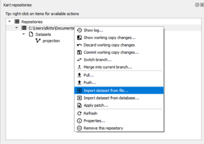 The repository will then appear within Kart in the list of repositories and can be interrogated with the above tools. A remote repository can also allow multi-user editing, providing the opportunity for conflicts which can be dealt with. See the [https://docs.kartproject.org/en/latest/ Kart documentation] for more details. |