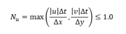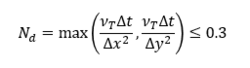|This numerical condition relates to the sub-grid scale eddy viscosity term which causes diffusion of momentum. To maintain stability the product of the eddy viscosity coefficient (ν_T) and the timestep (∆𝑡) divided by the square of the grid spacing (∆𝑥2) must remain below 0.3. |