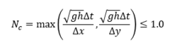 |This numerical condition relates to the shallow water wave celerity (wave speed) and is derived from the fluid flow equations to represent long waves (i.e. wave length is substantially longer than the water depth). The product of the model timestep (∆𝑡) and the long wave speed (square root of the gravity (g) and water depth (h)) must be less than the cell size (∆𝑥), for the condition to be satisfied. |