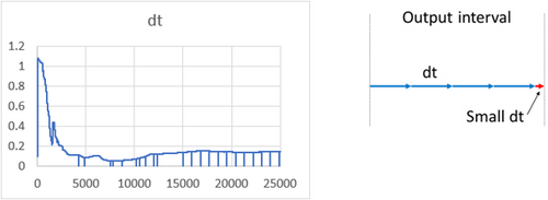 HPC uses an adaptive timestep derived from the hydraulic conditions during a simulation. This timestepping approach creates a situation where the computational timestep does not always align exactly with the specified map and time series result output intervals. To account for this TUFLOW HPC makes a timestep adjustments to synchronize the computational timestep with output reporting times. When this occurs the minimum timestep (dt) reported in hpc.dt.csv will report a reduced timestep. This adjustment doesn’t have any effect on the hydraulic calculations, and as such, is not reported in the hpc.tlf or shown in the dt map output. The "dtStar" column in the hpc.dt.csv file also reports the calculated 2D target timestep without any result output synchronisation applied. If the hpc.dt.csv file is being used to quality check the health of a simulation, "dtStar" should be used for the analysis, not "dt".<br> |