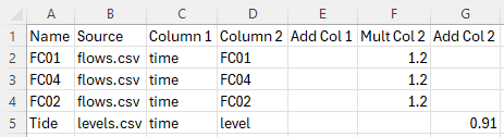 This file contains the boundaries after any modifications in the bc_dbase are applied. In the boundary database below, the first three boundaries have a multiplier of 1.2 (20% increase in flows), the fourth boundary ("tide") has an add value of 0.91m in column G, which is added to all values in the water level boundary. For example, this can be used to setup a climate change sensitivity simulation. The _1d_bc_tables contains the final boundary data used in the model.